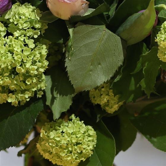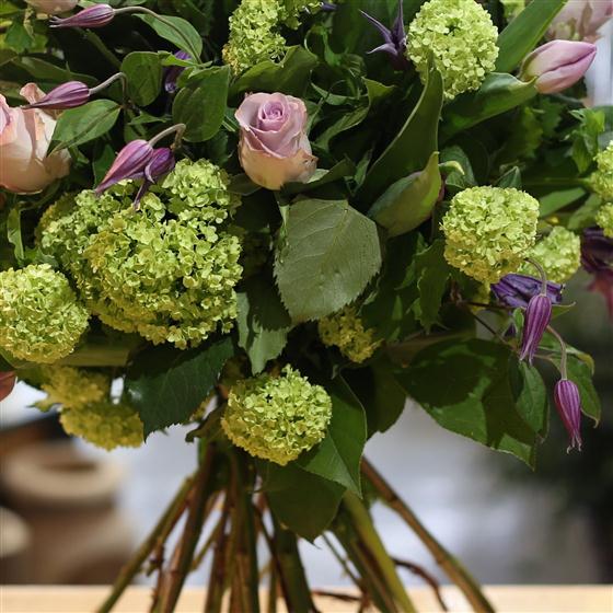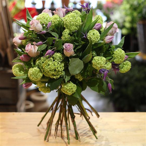 A spring twist on the classic dozen roses. Green viburnum, lilac tulips and seasonal foliage encompass a 12 lilac roses. Beautifully wrapped and presented in water.