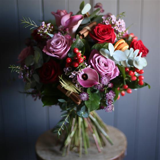 A beautiful winter bouquet of seasonal flowers in Mulled wine colours.