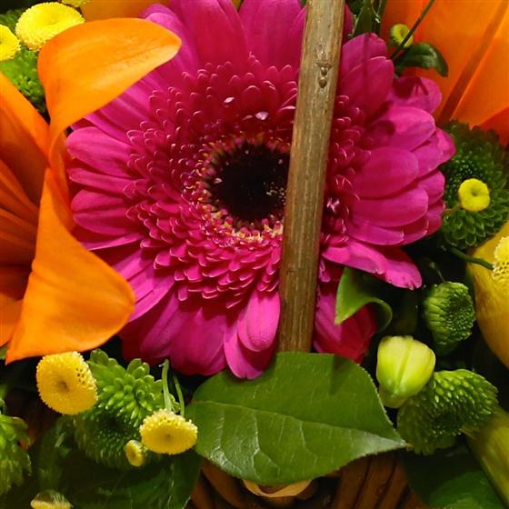 This beautiful basket arrangement is simply overflowing with fresh flowers in warm and vibrant shades, making a truly eye-catching display. The bright orange lilies partner perfectly with golden yellow roses and hot pink germini. It’s a radiant choice that is sure to light up any room.